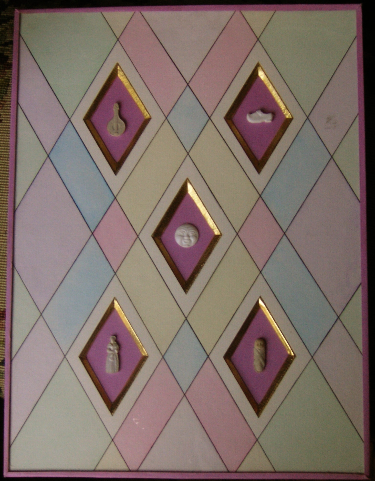 Utilisations de 2 papiers, en positif et négatif, utilisation d’une baguette identique. 4 techniques différentes proposées, une pour le document en hauteur, 2 groupes de techniques différentes en positif/négatif, un groupe de 3 gravures avec la même technique. On se retrouve donc avec 4 passe partout d’une couleur et 4 de l’autre couleur.Il faut choisir pour cela 2 papiers assortis qui iront bien aussi bien sur le passe partout que contre le sujet à encadrer.Dans le cas présent, il a été choisit une même marge autour du document à encadrer. De ce fait cela permet un accrochage différencié sur différents murs ou sur un seul en fonction de la place ou de son goût.